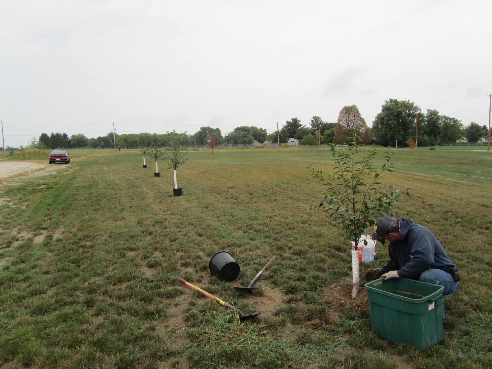Chad mulching the first of four trees we planted in the rain(drizzle) on Wednesday.